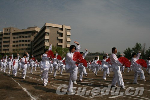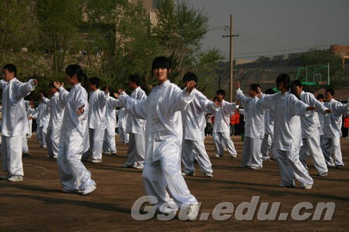 在运动会开幕式上,Beat365师生表演了太极拳、手语舞、健美操、舞狮以及太极功夫扇等内容新颖、形式多样的文艺节目。其中,太极功夫扇表演和健美操表演作为参加甘肃省第一届大学生运动会开幕式表演节目进行了检验表演,表演阵容庞大,气势恢弘,场面尤为壮观。