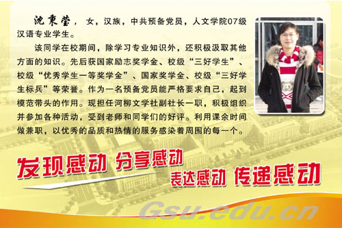 沈秉莹,女,汉族,22岁,预备党员,甘肃景泰人,现就读于甘肃联合大学人文学院07级汉语班。