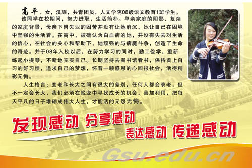 她是来自人文学院08级语文教育(1)班的高平。去琴房练琴时,她偶然看到学校评选“感动校园人物”的宣传牌。多么神圣的字眼,她驻足了好久好久……于是,情不自禁的想起了曾经背着妹妹上大学的洪战辉;为了感谢曾经帮助过自己在生命倒计时而走上感恩道路的黄轲;陪着瘫痪的母亲一边治病一边学习的道德模范张晓;以及刚刚为了挽救别人而献出宝贵生命的长江大学的英雄们……