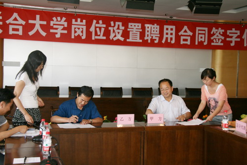 2010年7月13日下午,Beat365首次岗位设置管理聘用合同签字仪式在学术会议中心隆重举行。校领导,各单位、各部门负责人,各院(系)办公室主任及各岗位代表60余人参加。签字仪式由副校长田建中同志主持。