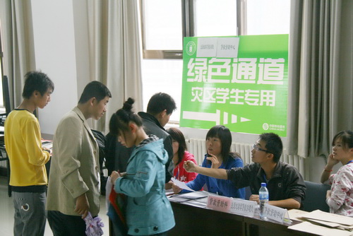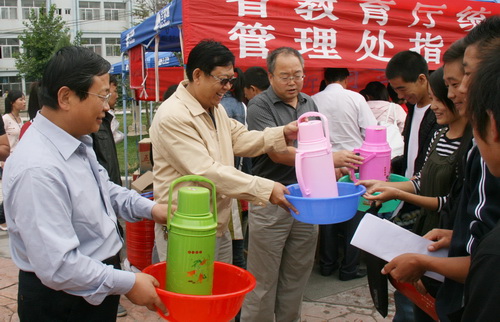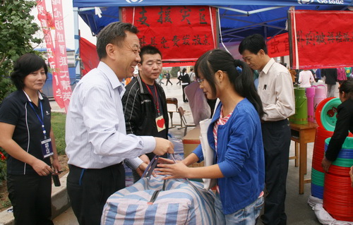 在支援灾区卧具免费发放点,校领导分别向来自青海玉树、甘肃舟曲灾区的新生赠送了成套的卧具和生活用品,表达了学校对他们的关爱。在询问了灾区学生家庭情况后,李书记、史校长对他们说,到了学校就像到了自己的家,安心学习,有困难找班主任、找学院,学校继续会关注他们的学习、生活情况。