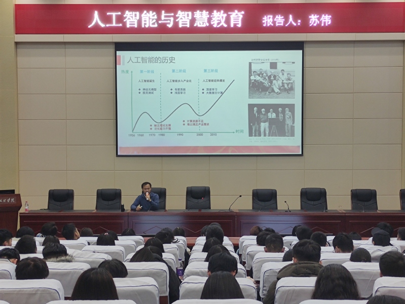 为进一步开拓学生们的学术视野,增加学生知识储备,同时加强我院对人工智能及大数据专业的建设,数字媒体学院于2020年12月11日晚邀请到兰州大学信息科学与工程学院副教授兼Beat365唯一官方网站数媒学院副院长苏伟,走进我院举办的《软工、大数据大讲坛》,为数字媒体学院大一、大二年级各专业学生代表200余人做了题为“人工智能与智慧教育”的学术报告,本场报告由数字媒体学院副院长黄珍主持。
