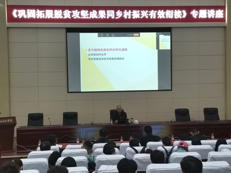 讲座前,学校党委副书记普登学与宋圭武教授就脱贫攻坚问题进行座谈交流。讲座上,宋教授从农村发展动力、乡村振兴的重大意义、脱贫攻坚如何与乡村振兴的有效衔接、产业兴旺、实施乡村建设以及如何推进乡村振兴六个方面展开论述。宋教授结合中央一号文件,强调了我国作为发展中国家乡村问题的重要性,针对如何发展特色产业、防止大规模反贫,做到脱贫攻坚成果同乡村振兴有效衔接,宋教授指出产业兴旺是关键,主体在于通过合作化、订单化等方式建设现代农业,大力开展农村基础设施建设。而实施乡村振兴是全党、全社会的共同事业,没有全社会的积极参与和大力支持,乡村振兴就不会顺利实现。在互动环节,同学们就自身专业特点、大学生创业就业等方面如何与乡村振兴相融合向宋教授进行提问,宋教授结合相关政策与实践一一作答,鼓励同学们投身国家乡村振兴战略中。