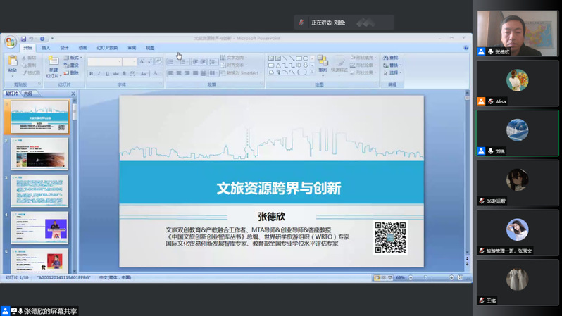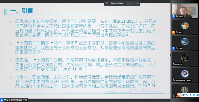 2021年11月11日15:00旅游学院召开了题为“文旅资源跨界与创新”的线上学术讲座。本次学术讲座由学院党总支副书记刘锐主持,主讲嘉宾为中关村智慧旅游创新协会会长、旅游创业创新研究院执行院长张德欣教授,参加本次讲座的成员有学院部分老师和全体同学。
