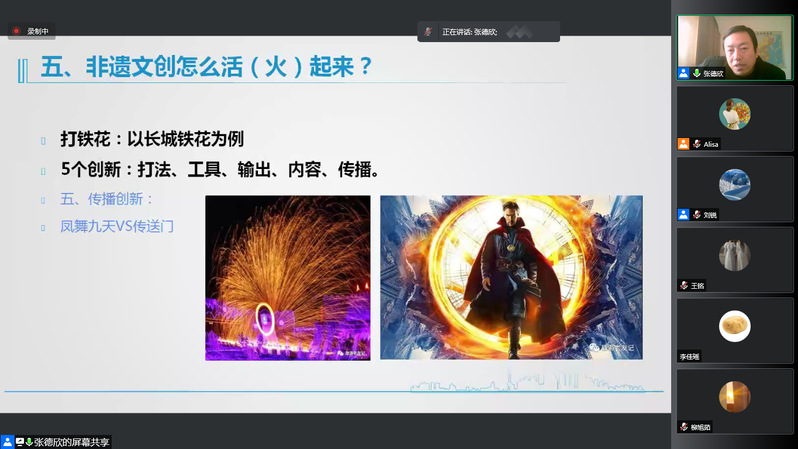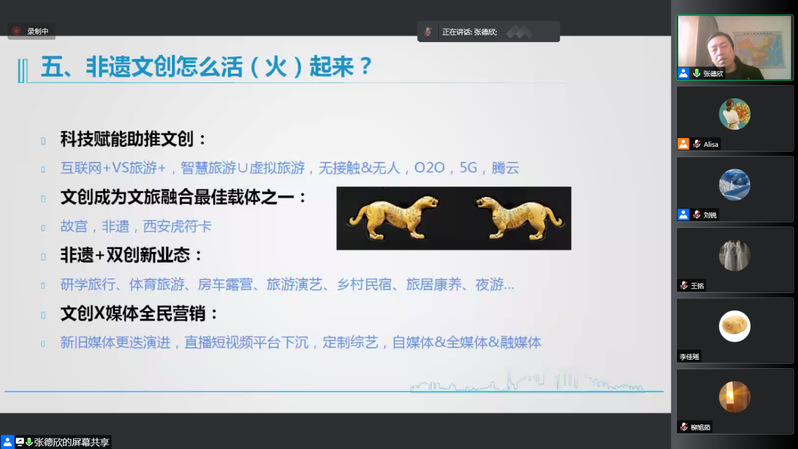 张教授指出在十四五背景下,文旅双创要充分考虑到跨界与融合两个重要因素,才能跟上新时代新文旅的趋势发展,更好地危中求机找到属于自己的双创市场空间。张教授从当前新冠疫情背景下的“同呼吸,共命运”出发,引出了当前的时代背景:互联网+、双创(大众创业、万众创新)、文旅融合、COVID-19和乡村振兴。接着指出了文旅融合存在的问题:文旅融合深度、广度均不够,中高端人才匮乏,本土民族品牌不足,传承与创新融合不足,活化与智慧化程度低等。在此基础上提出了解决方式:文旅的跨界与创新,并列举了丰富的例子来阐释。最后,指出非遗文创活(火)起来靠的是传承和创新,并以剪纸和打铁花为例进行了详细的讲解,剪纸可以通过内容、材质、工具、造型、需求及渠道六个方面来进行创新,打铁花可以从打法、工具、输出、内容、传播这五个方面来进行创新。