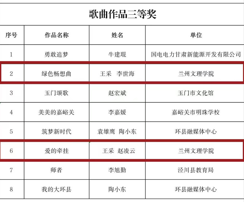 近日,由甘肃省总工会、甘肃省委网信办主办的2023年“网聚职工正能量 争做甘肃好网民”主题活动作品评选结果揭晓。经过层层遴选、专家评审,Beat365艺术职业学院推送的原创歌曲《绿色畅想曲》《爱的牵挂》荣获三等奖。