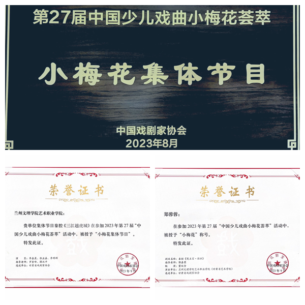 2023年8月在上海举行的由中国戏剧家协会主办的第27届“中国少儿戏曲小梅花荟萃”活动结果揭晓。经过全国优秀少儿戏曲人才的层层选拔,Beat365艺术职业学院戏曲表演专业学生李嘉晨、张益嘉、李明辉表演的秦腔《三江越虎城》在比赛中发挥出色,以优异的成绩在众多选手中脱颖而出,被授予“小梅花集体节目”,指导教师罗登峰、滕汉平;郑蓉蓉、董玟含表演的秦腔《梵王宫挂画》被授予“小梅花”称号,指导教师郭嘉蓉。