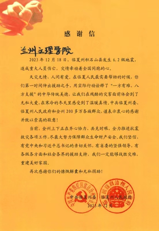 临夏州积石山县地震灾情发生后,学校积极响应省委、省政府及省教育厅的号召,第一时间向积石山县灾区捐赠价值100万元的152间移动式活动板房及1组移动卫生间。