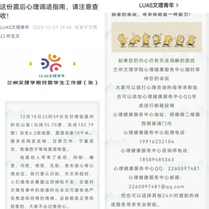 临夏积石山地震发生后,学生工作部(处)心理健康服务中心采取多种措施,积极开展心理援助行动,为学生提供心理、思想上的持续疏导和关爱,帮助受灾情影响的学生尽快回归到正常学习和生活中。
