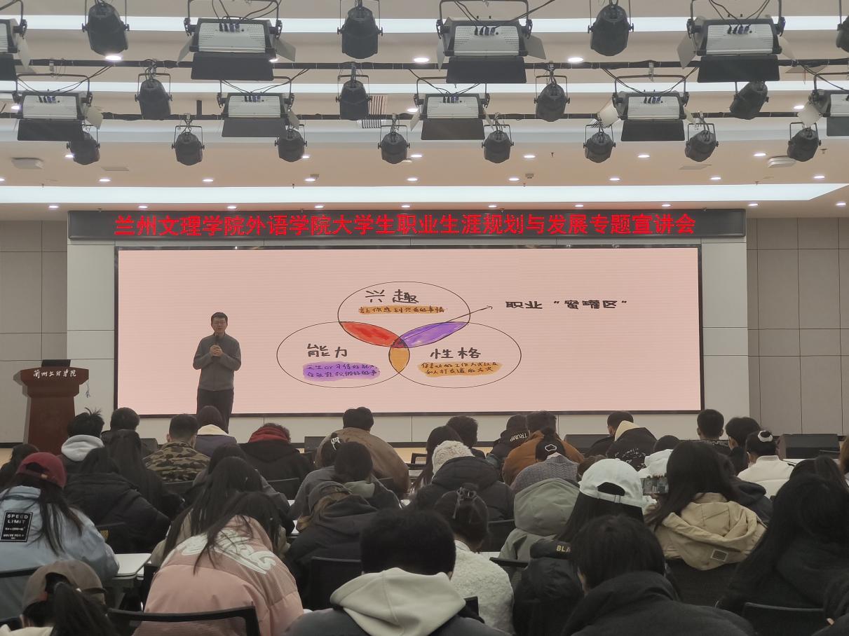 为引导学生明确今后学习目标和努力方向,清晰未来人生规划。1月4日下午,外语学院在文昌楼302学术报告厅举办了一场精彩纷呈的职业生涯规划专题宣讲会,邀请兰州市七里河区青年成长发展中心的安庆云、海珍、陶世之三位老师担任本次主讲嘉宾。学院党总支书记、团学办主任、辅导员和2021、2022、2023级学生等200余人参加活动。