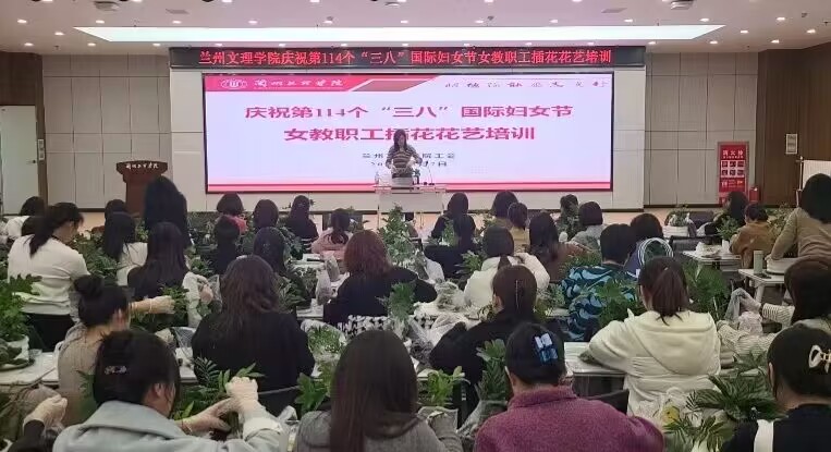 兰州行走文化创意服务有限公司花艺培训师丁亦女士围绕中国传统插花的美学意象、花材识别、插花技巧等三个方面进行授课,重点通过实践演示插花艺术的基本技巧。女教职工表现出了极大的兴趣,兴致盎然地练习插花技艺,每个人在老师的指导下完成了一件件精美的花艺作品,为“三八”国际妇女节增添了一道亮丽的风景线。