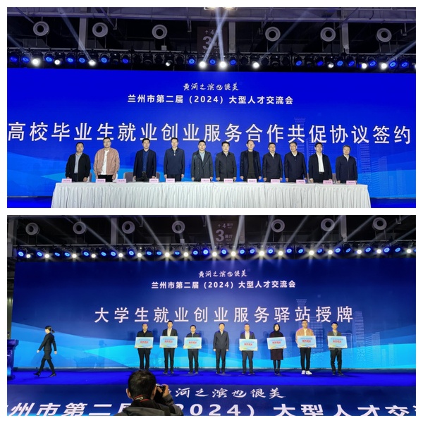 在人才交流大会的启动仪式上,学校党委委员、副校长张兴辉教授代表学校与兰州市人力资源和社会保障局签署了《高校毕业生就业与创业服务合作共促协议》,学生就业部门负责人领取了“大学生就业创业服务驿站”牌匾。