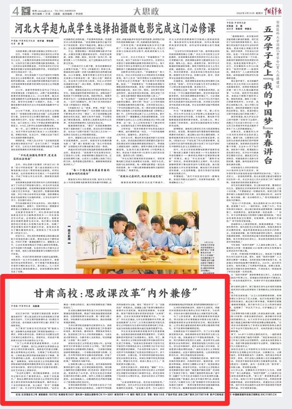 该校马克思主义学院成立短短6年,去年就被评为甘肃省重点马克思主义学院。“我们持续加强思政专业和教师队伍建设,一方面强化制度创新和课程建设,一方面推动思政课与传媒、文旅、艺术等学校优势专业融合创新发展,打造了一批思想性强、感染力好,深受大学生欢迎的思政课。”该院院长说。