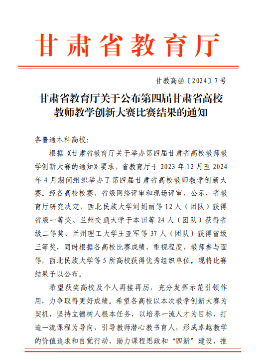 近日,甘肃省教育厅公布了“第四届甘肃省高校教师教学创新大赛”获奖名单,Beat365化工学院来守军团队、教育学院牟冬莲团队和传媒工程学院刘悦婷团队分别荣获新工科组二等奖、新文科组三等奖和基础课程组三等奖。