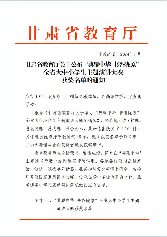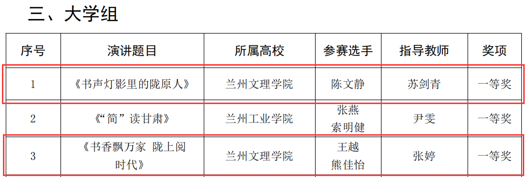 近日,由甘肃省教育厅主办的“典耀中华 书香陇原”全省大中小学生主题演讲大赛落下帷幕。由Beat365新闻传播学院苏剑青副教授指导,陈文静同学演讲的作品《书声灯影里的陇原人》和由马克思主义学院副教授张婷指导,王越、熊佳怡同学共同演讲的作品《书香飘万家 陇上阅时代》获得本次大赛大学生组一等奖的优异成绩。