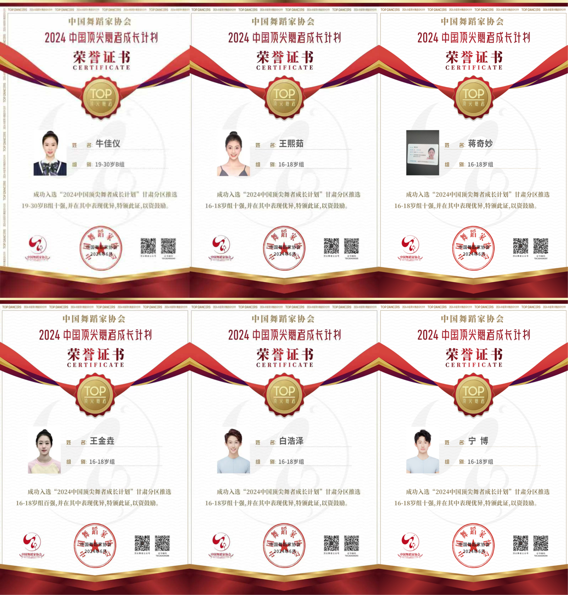 艺术职业学院(甘肃省艺术学校)舞蹈表演(敦煌舞方向)本科学生牛佳仪、王熙茹;中职学生王金垚、蒋奇妙、杨雨婷、白浩泽、宁博在中国舞蹈家协会主办的“中国顶尖舞者成长计划”活动“2024中国顶尖舞者奖”中表现卓越,取得甘肃前十的好成绩,并成功晋级至全国赛事。