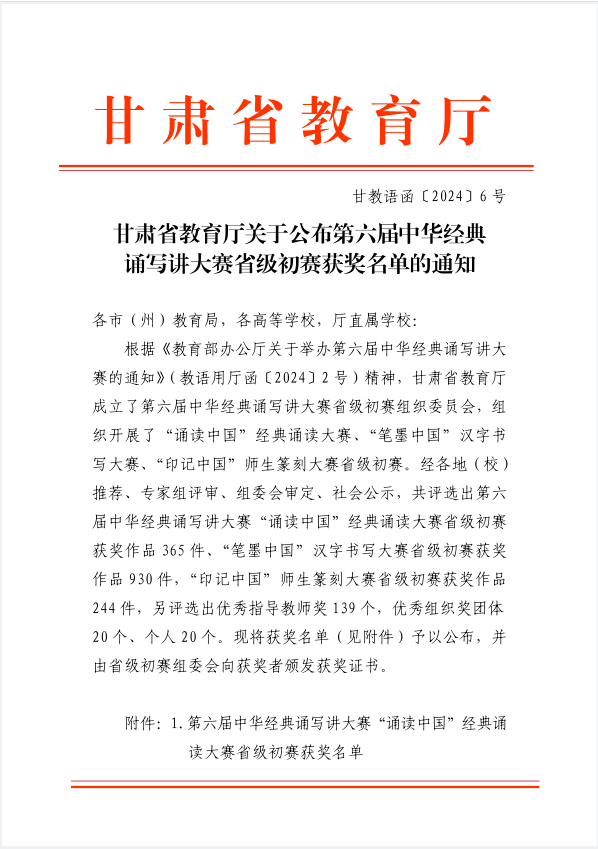 表 第六届中华经典诵写讲大赛甘肃省初赛获奖名单