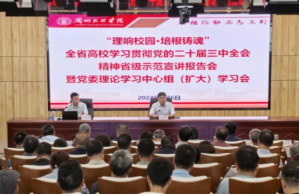 9月6日下午,学校在文昌楼学术报告厅举行“理响校园·培根铸魂”全省高校学习贯彻党的二十届三中全会精神省级示范宣讲报告会。省委教育工委宣讲团成员、西北师范大学马克思主义学院副院长王树亮副教授作宣讲报告。报告会由党委书记苟永平主持,全校副科级以上干部、学生代表共200余人聆听了报告。
