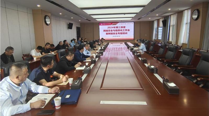 9月25日上午,学校在文昌楼12楼会议室召开2024年第三季度网络安全与信息化工作会暨网络安全专题培训,各单位、各部门主要负责人,各二级学院党总支书记参加了会议,会议邀请甘肃赛飞安全科技有限公司网络安全专家谢占斐做专题讲座。会议由网络安全和信息化领导小组副组长、副校长张焱主持。
