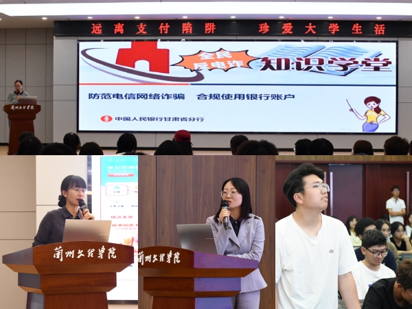 中国人民银行甘肃省分行支付结算处认证高级讲师郭园媛、招商银行总行消费者权益保护与服务质量认证优秀讲师满玲君、招商银行兰州分行合规管理及反诈骗宣传专员井晓玮、招商银行兰州分行消费者权益保护与服务质量认证优秀讲师吴俁,分别围绕“远离支付陷阱,珍爱大学生活”“如何防范杀猪盘诈骗、网络交友套路、交友骗局等新型诈骗类型”“生活中的‘两卡’”“反诈从身边做起”等内容,通过具体详实的案例、引人入胜的视频,详细讲解了常见的支付欺诈手段、支付陷阱风险以及规避策略,使用银行卡和电话卡的注意事项,立体展现了花样百出的新型诈骗,传授了反诈妙招,深化了同学们对金融知识的理解,教育引导同学们增强金融风险防控意识,树立科学的消费观和正确的价值观。