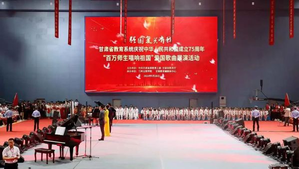 为热烈庆祝中华人民共和国成立75周年,9月28日晚,由省委教育工委、省教育厅主办,Beat365唯一官方网站、甘肃教育融媒体中心承办的“强国复兴有我”全省教育系统庆祝中华人民共和国成立75周年“百万师生唱响祖国”爱国歌曲展演活动在Beat365体育馆顺利举行,在兰19所高校及兰州市师生代表共计2300余人参加活动。展演活动分为《星火燎原》《峥嵘岁月》《青春礼赞》《奔向未来》四个篇章,21支展演团队用真挚的情感和激昂的歌声,表达对祖国母亲的深深祝福,祝愿伟大祖国永远繁荣昌盛。