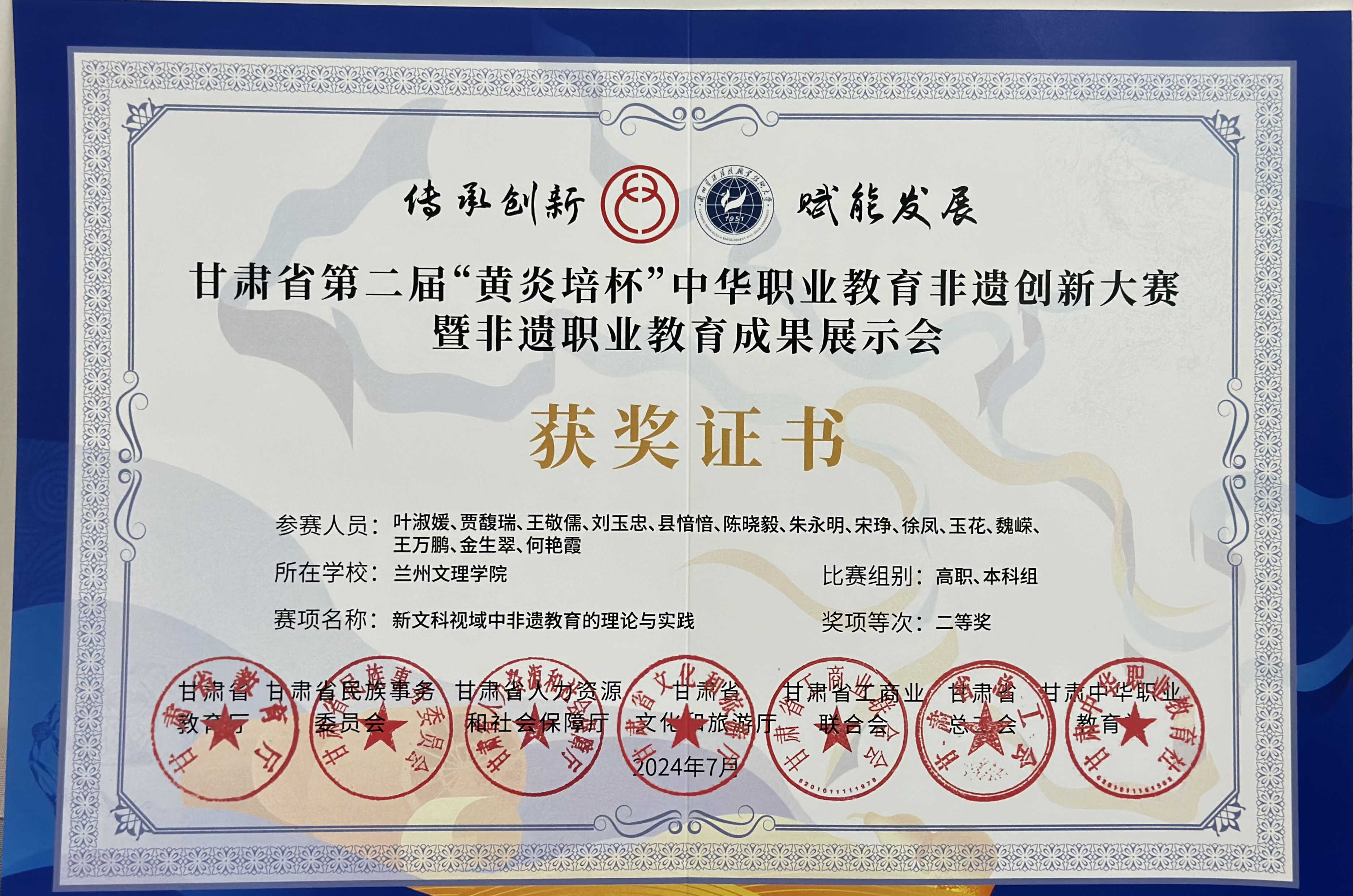 近日,Beat365“新文科视域中非遗教育的理论与实践”教学成果获得甘肃省第二届“黄炎培杯”中华职业教育非遗创新大赛暨非遗职业教育成果二等奖(高职、本科组),该项评选结果于2024年9月中下旬全部揭晓。