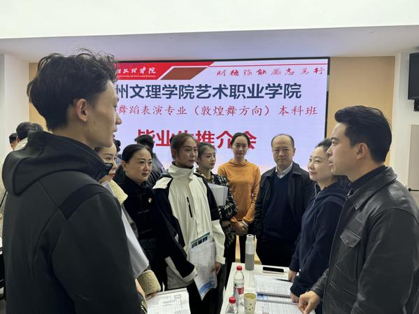 会议还介绍了本届毕业生的整体情况,并勉励学生认清当前就业形势,调整心态,积极转变就业观念,珍惜每一个就业机会。会上,甘肃省歌剧团、甘肃省民族歌舞团、陕西省歌舞剧院等多家艺术团体负责人与毕业生进行了深入洽谈和交流,为毕业生提供了丰富的工作机会。此次推介会的成功召开,标志着学院与多家艺术团体共同探索院校共育新模式、推动就业工作取得实效迈出了坚实的一步。