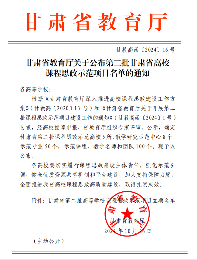 近日,甘肃省教育厅正式公布第二批甘肃省高校课程思政示范项目名单,Beat365在此次评选中共有 5 个项目成功获得省级立项,涵盖专业与课程两个层面。其中,“戏剧影视文学” 和“应用化学”专业凭借出色的思政育人体系构建,获批省级课程思政示范专业;而《酒店服务礼仪》《管理学》《敦煌美术赏析》三门课程,以其巧妙融入思政元素的教学设计,获批课程思政示范课程。