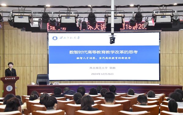 12月26日下午,学校邀请西北师范大学教育技术学院院长、博士生导师郭炯教授做《数智时代高等教育教学改革的思考》专题讲座。讲座由校党委委员、副校长刘畅教授主持。各二级学院教学副院长、教研室主任、教师代表共140余人参加了讲座。