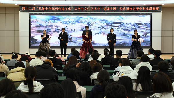 3月13日晚,第十二届“礼敬中华优秀传统文化”大学生文化艺术节之“诵读中国” 经典诵读比赛复赛在校园内精彩上演。比赛分专业组与非专业组,分别于实验剧场和文昌楼多功能厅同步举行。赛场上,参赛选手们紧扣热爱祖国、歌颂英雄、奋斗青春等主题,以充沛饱满的情绪、真挚动人的情感,将经典篇章演绎得淋漓尽致。经过激烈角逐,专业组与非专业组分别有14组和18组选手成功突围,顺利晋级决赛。期待参赛选手在决赛中更加出彩的表现。
