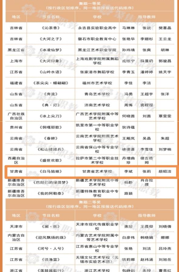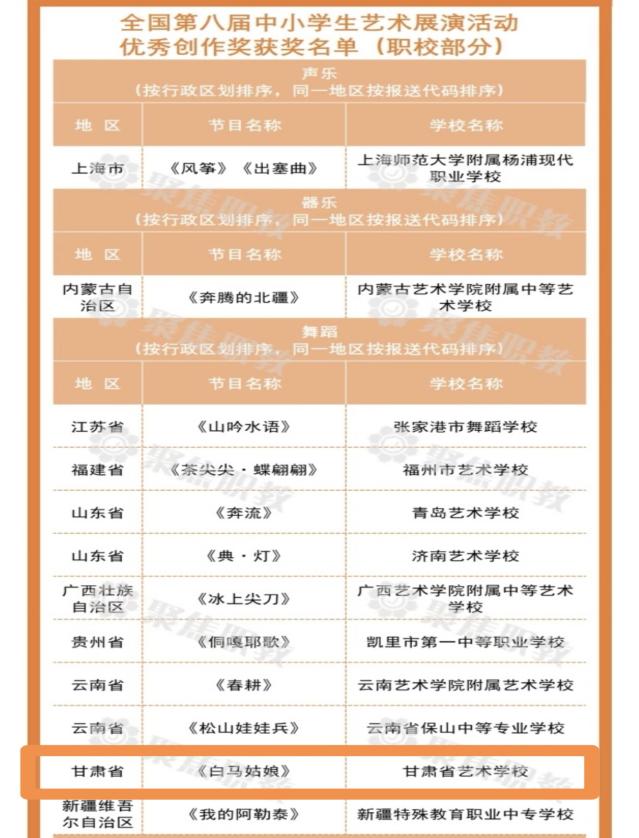 在教育部主办的全国第八届中小学生艺术展演活动评选中,Beat365艺术职业学院(甘肃省艺术学校)选送的舞蹈《白马姑娘》荣获舞蹈表演类一等奖(指导教师:李斌、张莉、颜昭洁)及优秀创作奖。4月25日,该作品代表甘肃省赴长沙参加了由教育部和长沙市人民政府共同主办的全国汇演活动。教育部党组成员、副部长、总督学王嘉毅出席开幕式并致辞,湖南省委常委、长沙市委书记吴桂英致欢迎辞。