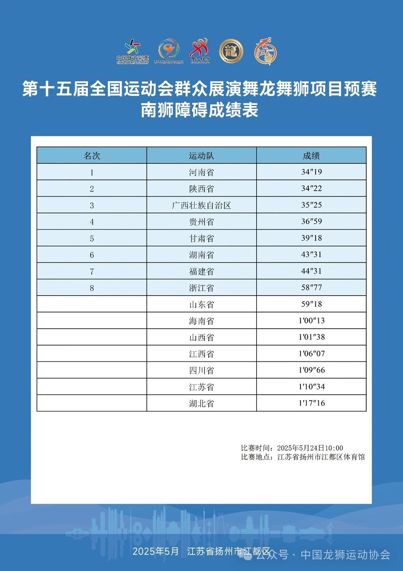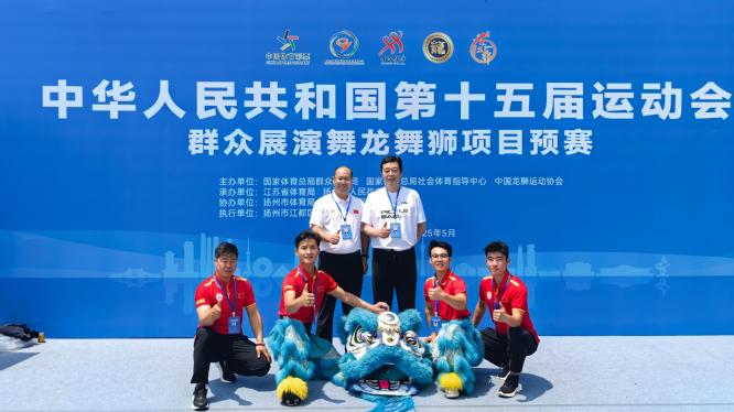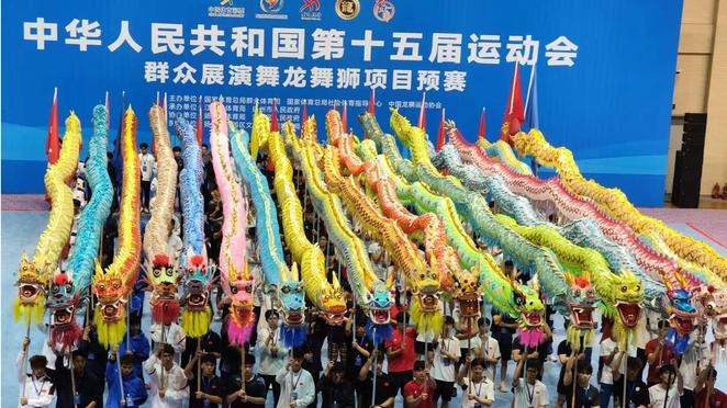 5月22日至26日,第十五届全国运动会群众展演舞龙舞狮项目预赛在江苏扬州江都体育馆举行。来自全国的23支运动队、约1300名运动员参赛,比赛项目有舞龙自选、舞龙规定、舞龙障碍、南狮自选、南狮传统、南狮障碍、北狮自选、彩带龙自选等8个项目。