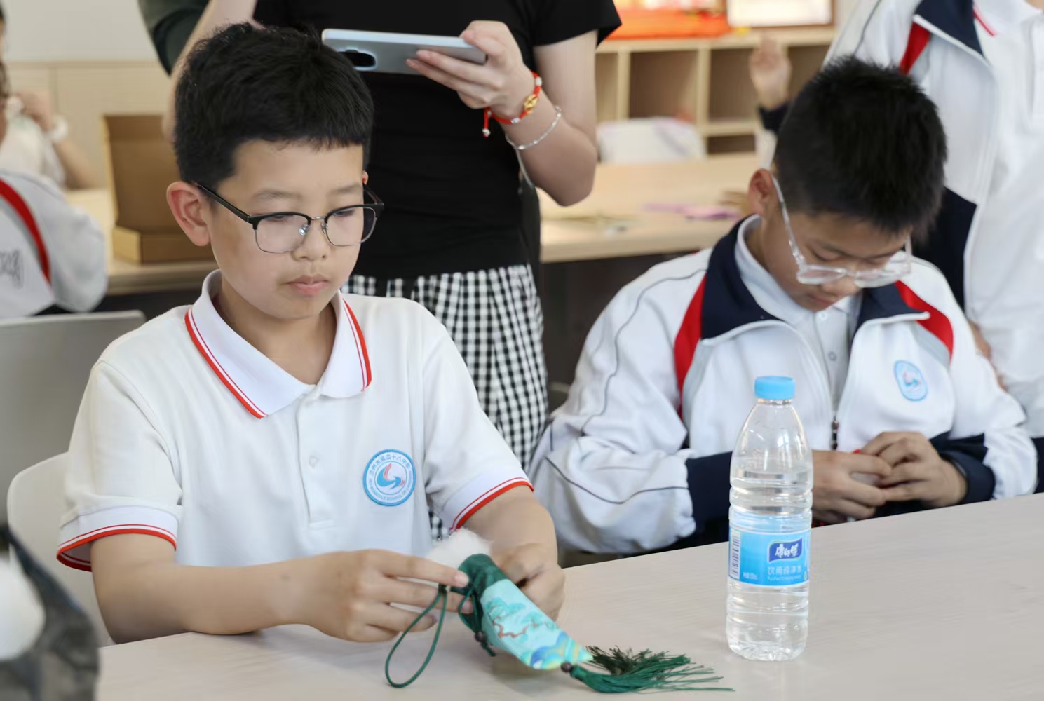 在实践环节,庆阳香包传承人包雨蕾现场传授香包制作技艺。学生们化身“小小传承人”,通过捻线、缝制、填香等步骤,亲手完成了属于自己的香包,让学生在手工制作中感悟匠心传承,使文化自信的种子在学生心中生根发芽,使家国情怀在潜移默化中茁壮成长。