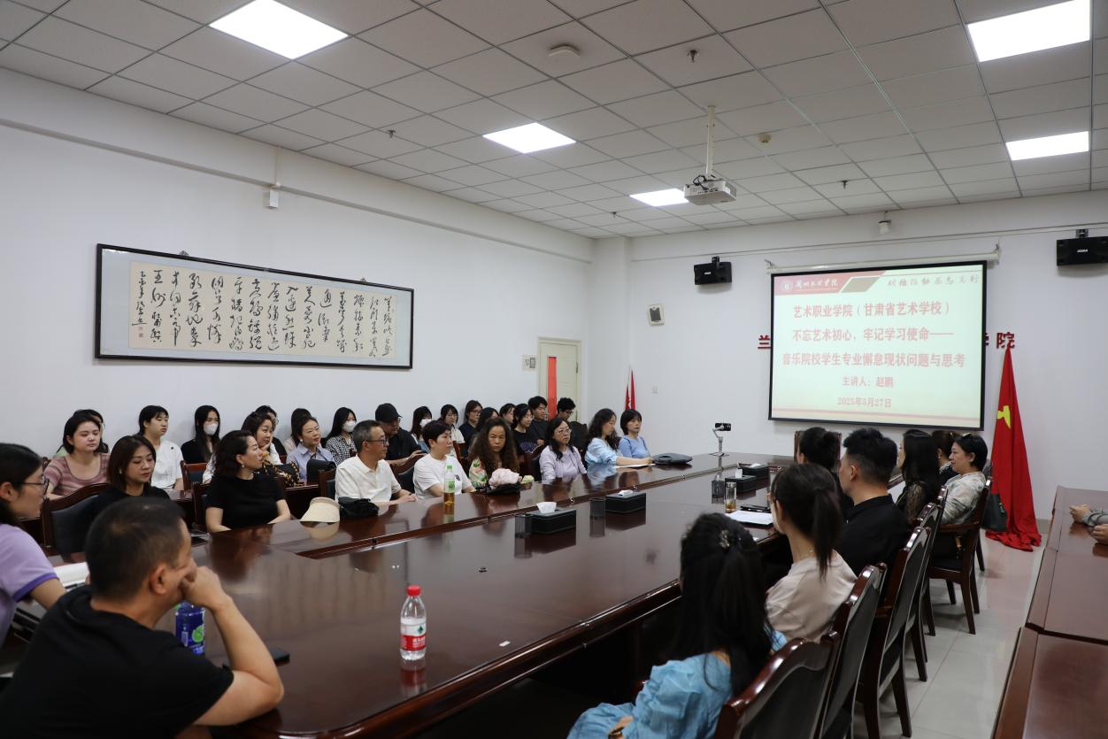 为全面提升教师教学创新能力与学生专业素养,助力学院音乐教育事业高质量发展,5月27日下午,由科技处、艺术职业学院(甘肃省艺术学校)举办的《不忘艺术初心,牢记学习使命——音乐院校学生专业懈怠现状问题与思考》学术讲座在笃行楼二楼会议室顺利举行。讲座特邀西北师范大学音乐学院教授、钢琴系主任赵鹏担任主讲嘉宾,艺术职业学院音乐专业、戏曲音乐专业师生到场聆听。