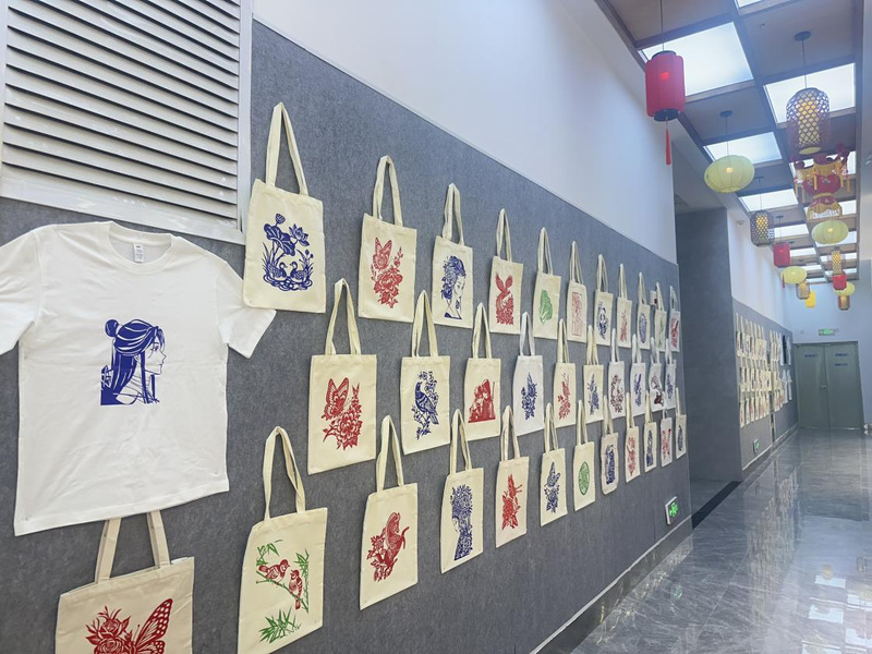 课程创新运用剪纸新材料,同学们采用剪纸转印技术,将传统生肖、“喜鹊登梅”“福禄寿喜”等吉祥纹样及当代动漫元素,通过热转印工艺呈现在白色短袖、帆布包等日常用品上。这一创新既实现了传统题材的现代表达,又完成了生活场景的艺术转化,彰显出非遗在青春视角下的蓬勃活力。