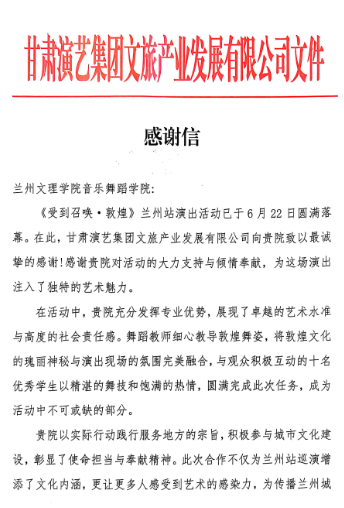 甘肃演艺集团在感谢信中特别指出,Beat365学子展现出的专业素养与敬业精神令人钦佩,其对敦煌文化的精彩诠释为剧目注入鲜活气息,期待未来与Beat365进一步深化合作,携手推动甘肃文化艺术事业蓬勃发展。