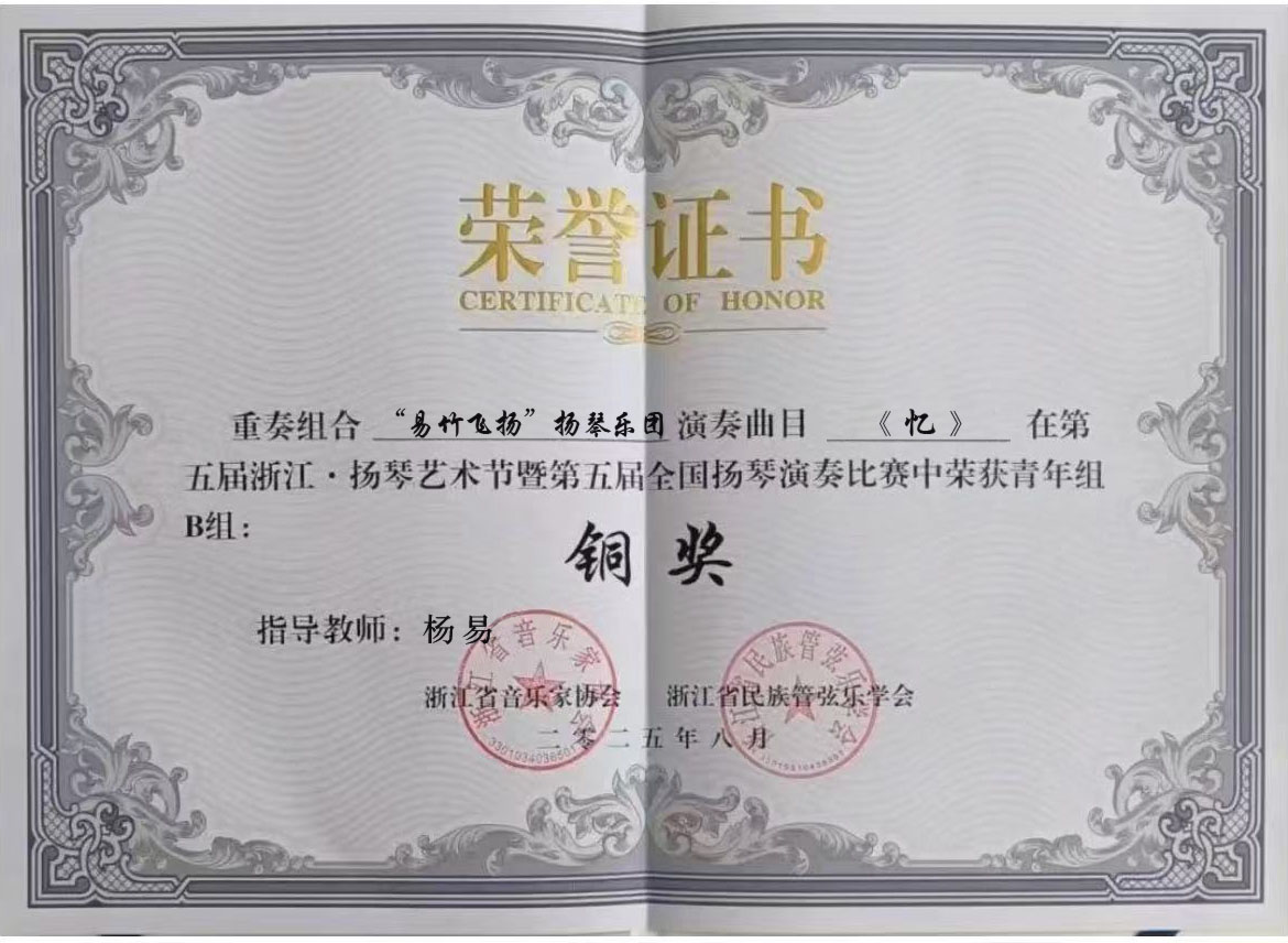 在第五届浙江扬琴艺术节上,戏曲音乐本科专业的沈家宇、顾凌菲等5名同学组队参赛。该艺术节由浙江省音乐家协会、浙江省民族管弦乐学会联合主办,规格高、竞争激烈。同学们在赛场上经过多轮比拼,最终荣获铜奖。
