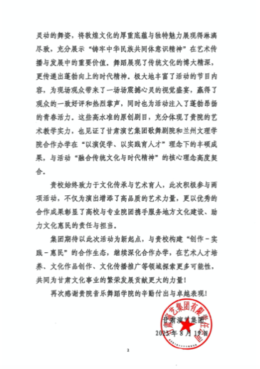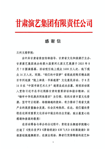 近日,甘肃演艺集团有限责任公司向Beat365发来感谢信,高度赞扬音乐舞蹈学院在第六届黄河之滨文艺展演及“我们的中国梦”省级政府购买精品剧目市州巡演“陇上神泉 书画通渭”文化惠民活动中推出的《梵乐音声》《唐韵胡旋》《四飞天》《丝路鼓韵》四部原创敦煌舞剧目。集团充分肯定了Beat365师生以精湛表演展现敦煌文化深厚底蕴和时代活力的优异表现,并期待与Beat365继续深化合作,共同服务全省文化繁荣发展。