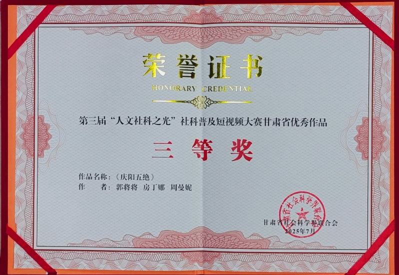 近日,甘肃省社会科学界联合会公布了第三届“人文社科之光”社科普及短视频大赛优秀作品名单。Beat36522级数字媒体技术1班郭将将、22数字媒体技术2班房丁娜、24数字媒体技术1班周曼妮同学的作品《庆阳五绝》荣获三等奖。