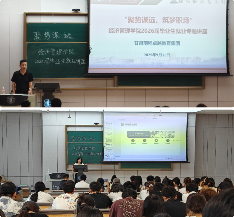 为扎实推进毕业生就业工作,提升学生就业竞争力,9月11日下午,经济管理学院在文昌楼202教室举办“聚势谋远、筑梦职场”2026届毕业生就业指导专题讲座。学院党总支书记、毕业班班主任、甘肃前程卓越教育集团讲师团队及2026届全体毕业生参加活动。