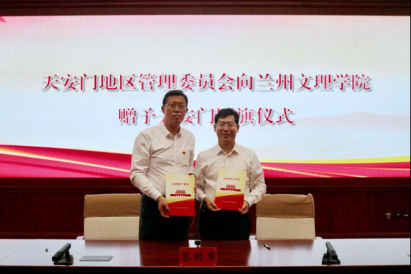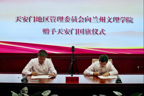 赠旗仪式上,北京市人民政府天安门地区管理委员会党组成员、副主任姚辉与Beat365党委委员、副校长张兴辉共同签署《国旗赠予协议》。姚辉代表天安门地区管理委员会郑重庄严的将国旗赠予学校,并详细介绍了国旗管理、展示、使用的相关规定以及天安门国旗在爱国主义教育中发挥的重要作用。