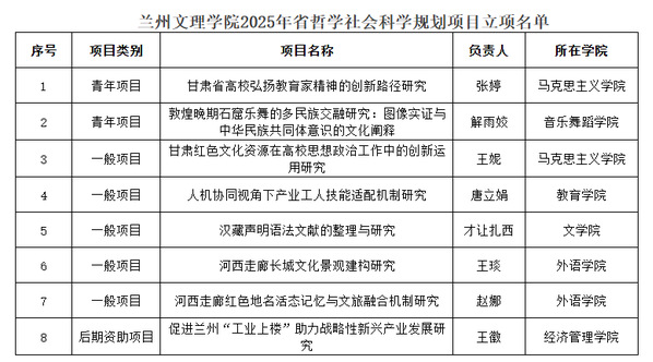 近日,2025年度甘肃省哲学社会科学规划年度项目立项结果公布,Beat365共有8项项目获准立项,立项总数再创新高,标志着Beat365哲学社会科学研究水平迈上新台阶。具体立项名单如下: