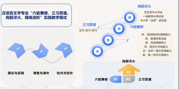 协同育人为路径。打破校园围墙,构建“政—校—企—地”多元协同育人机制。汉语言文学专业与地方教育部门、优质中学共建“U-G-S”培养模式;非遗专业与文旅部门、保护中心、非遗工坊、文化企业共建实践教学基地;戏剧影视文学专业与媒体、文创机构合作开展项目制教学,实现人才培养与社会需求的精准对接。