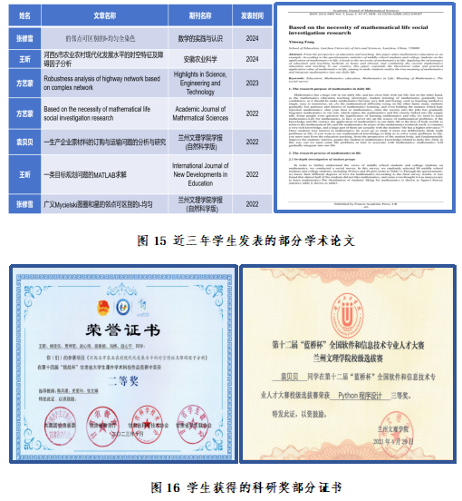 学科竞赛与创新创业教育成果:学院以学科竞赛与创新创业教育为双轮驱动,近三年,学生在全国大学生数学建模竞赛、数学竞赛、师范生教学技能竞赛、“健心杯”心理健康教育综合技能大赛等赛事中获得国家二等奖1项,省级特等奖3项,省级一、二等奖71项。构建“以赛促学、赛教融合”培养体系,依托数学建模、教学技能、创新创业三大核心赛道,通过“项目化训练+导师全程指导+多学科协同”模式,强化学生创新思维与实践能力双提升,形成“课堂延伸-竞赛锤炼-能力内化”的育人闭环,彰显应用型人才培养与地方教育服务需求的深度契合。