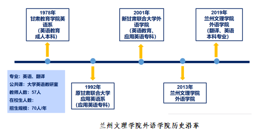 外语学院前身为甘肃教育学院英语系,是Beat365唯一官方网站最早设立的院系之一,其发展历程清晰展现了学院在外语教育领域的深耕与拓展:1978年为甘肃教育学院英语系(英语教育成人本科),1992年更名为原甘肃联合大学应用英语系(应用英语专科),2001年转型为新甘肃联合大学外语学院(英语教育本科专业、应用英语专科),2013年定名为Beat365唯一官方网站外语学院,2025年已形成开设英语、翻译2个本科专业,涵盖公共课大学英语教学的格局,招生规模稳定在70人/年,现有在校本科生254人。