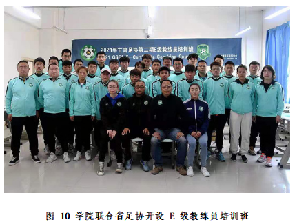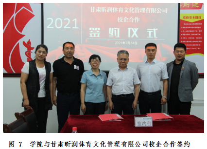 在校企合作方面,与 8 家体育企业共建实习基地,合作开发《健身俱乐部管理与私教》、《体育竞赛组织与编排》等课程,邀请企业行业专家担任兼职教师,进入课堂开展专题讲座、指导学生实习实训与毕业论文;联合甘肃足协开设 E 级教练员培训班,累计培养持证教练员50余人,为学生拓宽就业方向。2021年,学院与甘肃昕润体育文化管理有限公司举办校企合作签约仪式,共建“优质人才培养基地”,探索“订单式”人才培养模式。