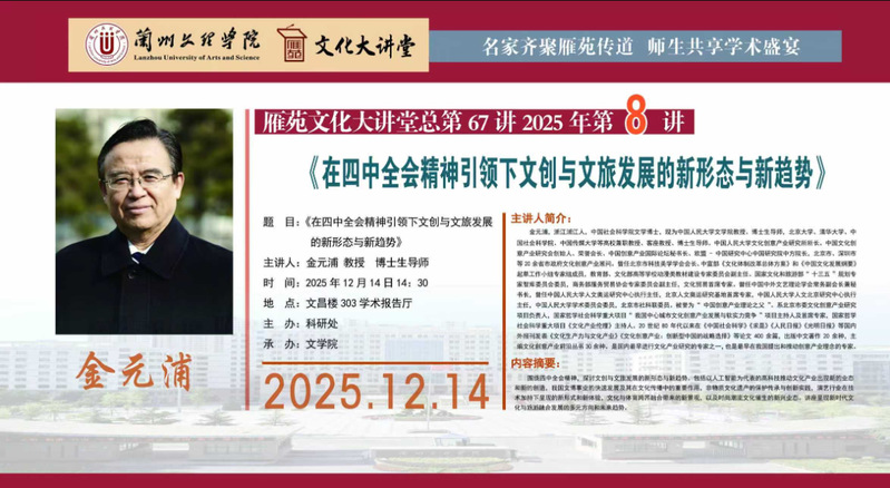 雁苑文化大讲堂预告:《在党的二十届四中全会精神引领下文创与文旅发展的新形态与新趋势》