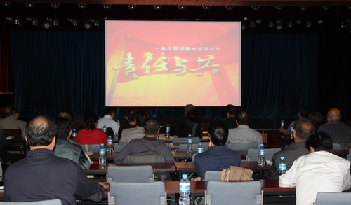 在主题教育会上,全体参会人员观看了反腐倡廉专题教育片《责任与共》。