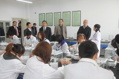 化工学院副院长展惠英向各位专家介绍化工模型室、流体输实训室、送传热换热实训室、精馏实训室、吸收解吸实训室、自动化仪表实训室、单元反应实训室、管路拆装实训室等18个实验室,专家们仔细考察询问实验设备的使用情况。
