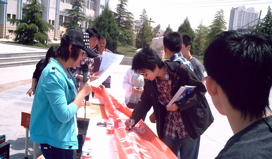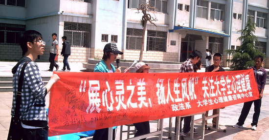 5月14日,政法系11级司法助理专业学生在北校区雁苑广场开展了“5.25大学生心理健康教育宣传月”系列活动之心理健康教育倡议签名宣传活动。